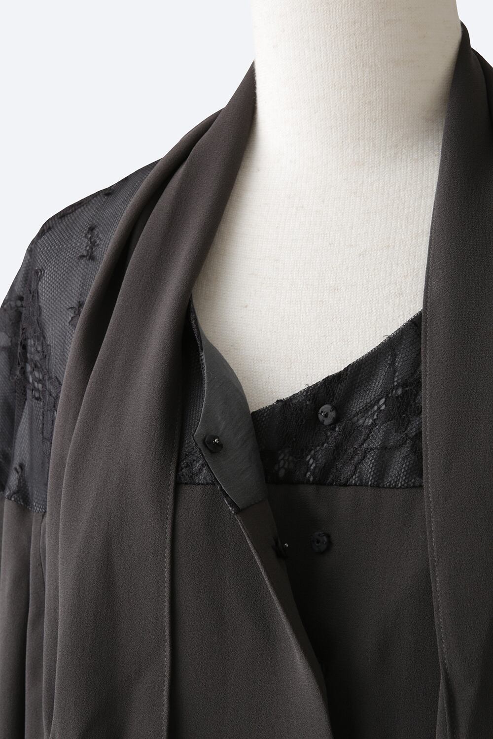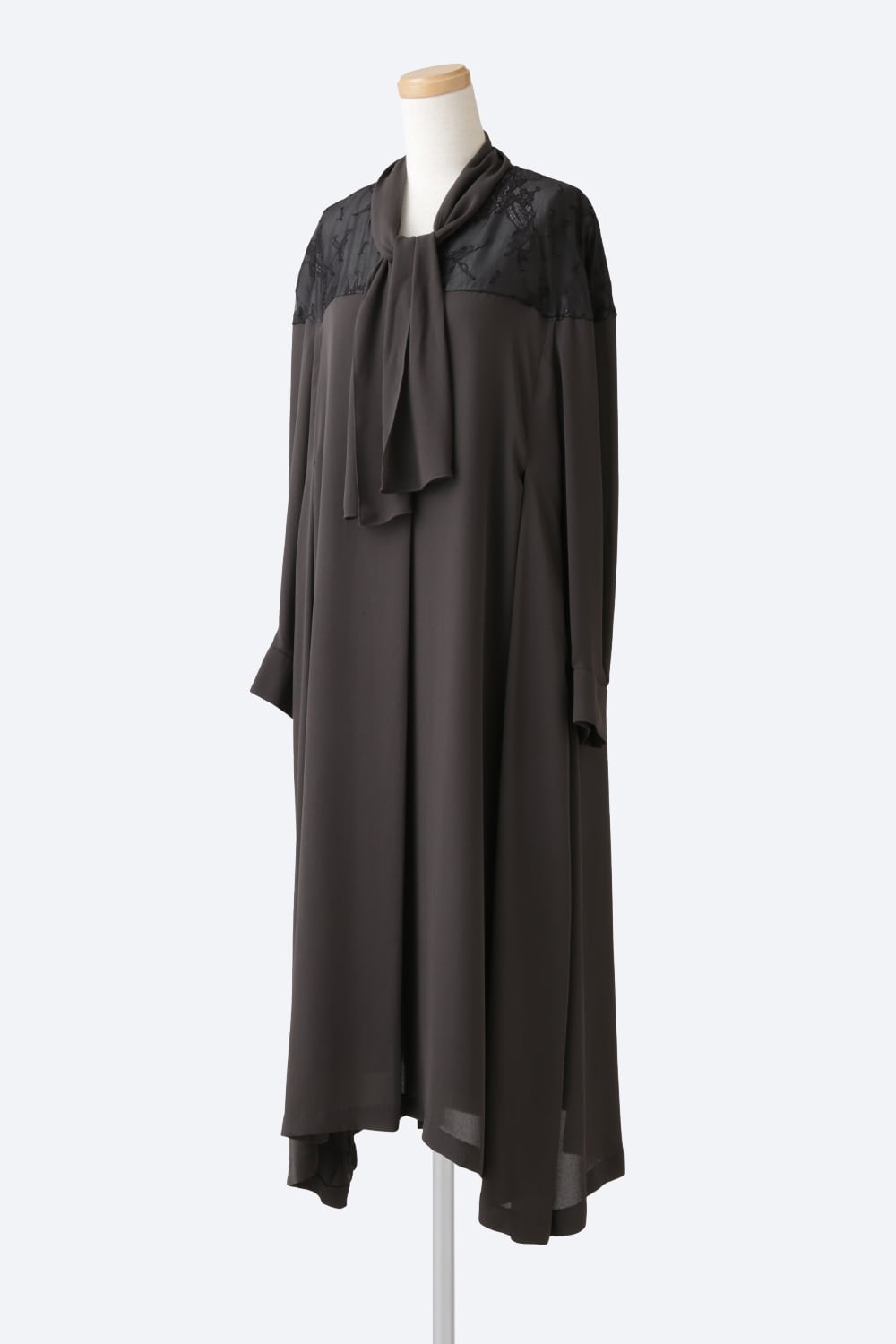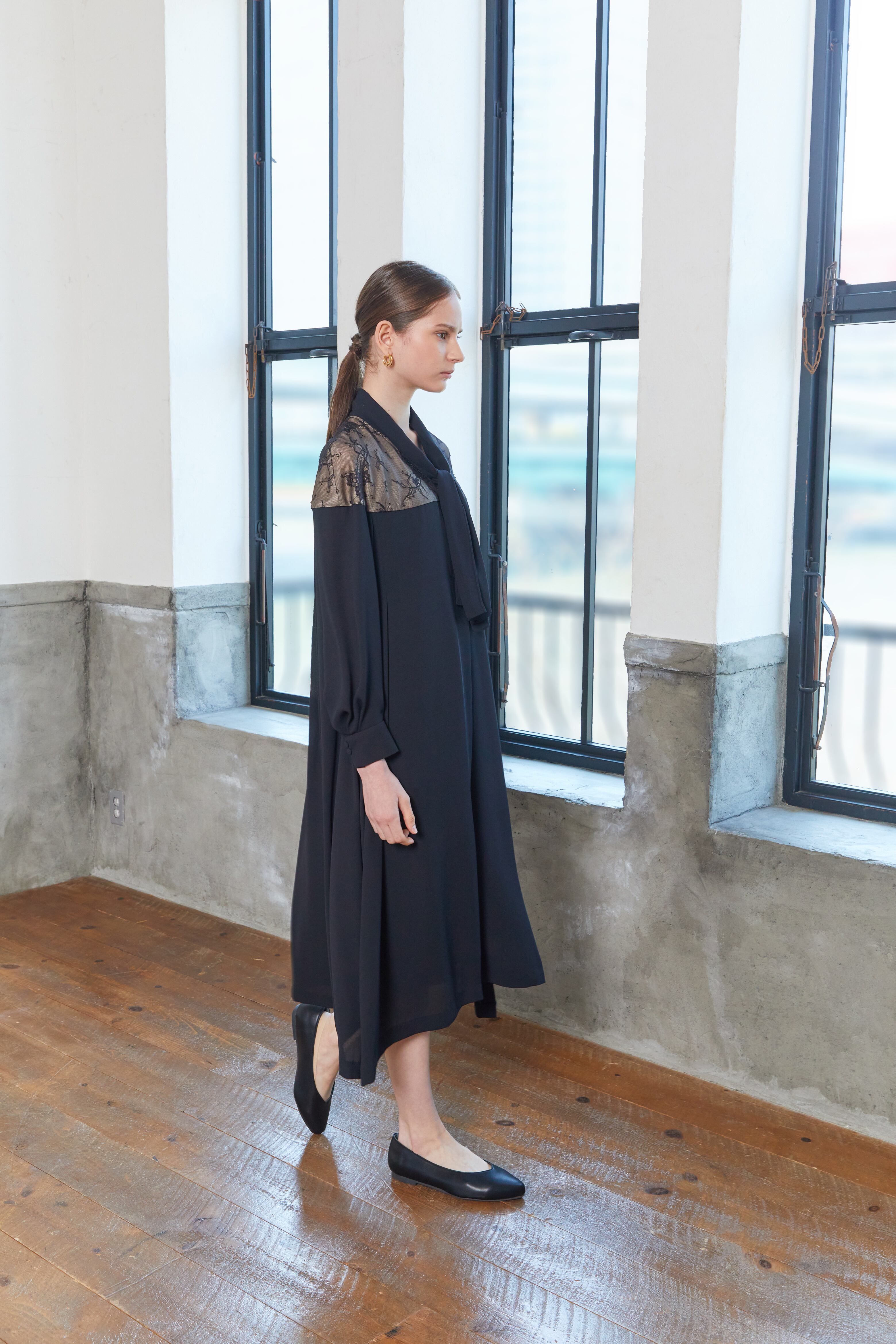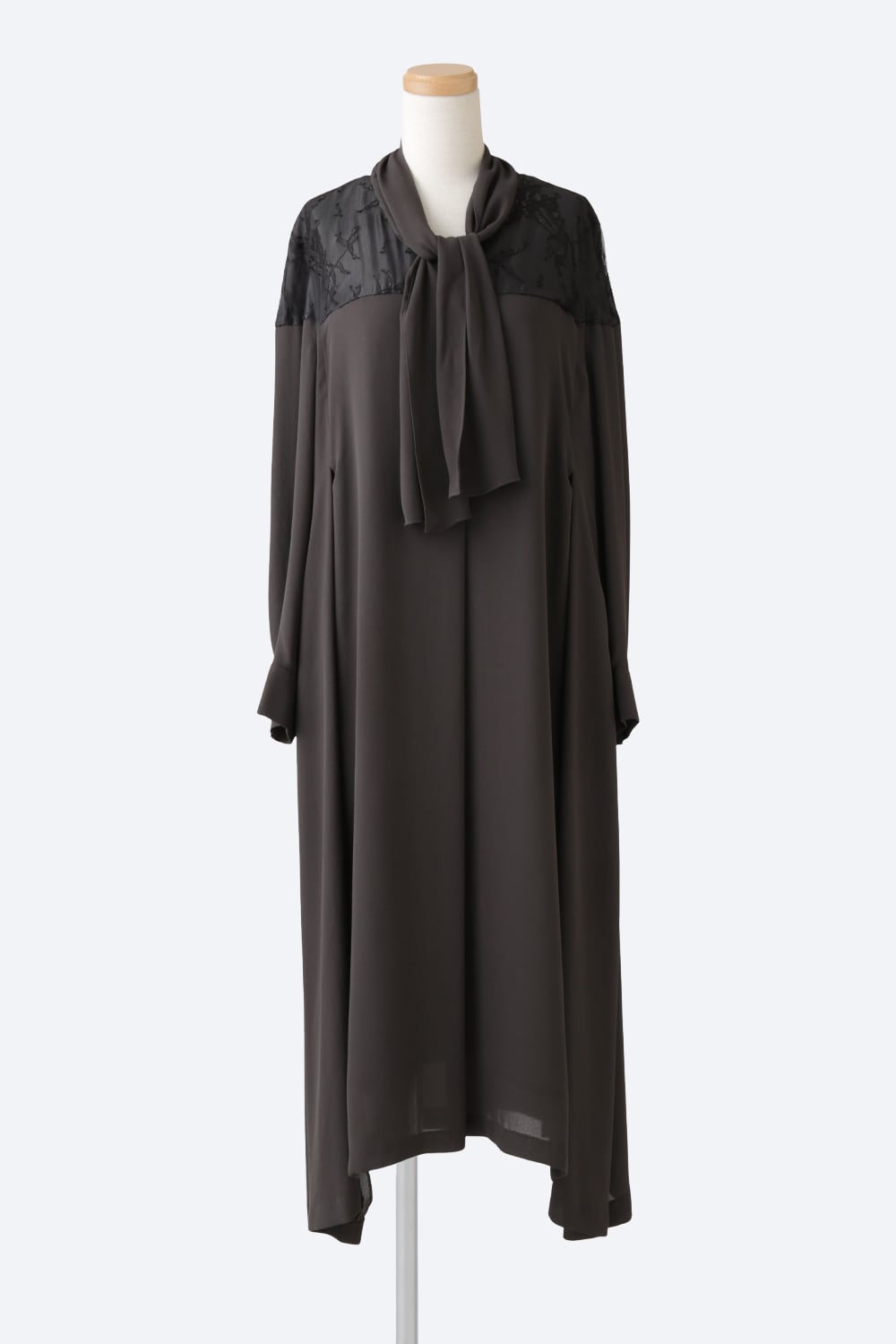 ふんわりとした肌触りと上品な落ち感が魅力のソフトな梨地ジョーゼット素材を使用したフェミニンな雰囲気漂う大人ワンピースです。首元にはクラシカルなムードのボウタイディテールをあしらい、上見頃に施したリバーレースが繊細で優雅なアクセントになっています。自然に広がるフレアータックのシルエットが女性らしい立体感を生み出し、動くたびに軽やかに揺れる美しいフォルムを創り出しています。前開き仕様で着脱しやすく、オケージョンからデイリーまで幅広く対応できるワンピースです。甘さを抑えたディテールと上質な素材使いで大人の女性に相応しい仕上がりになっています。