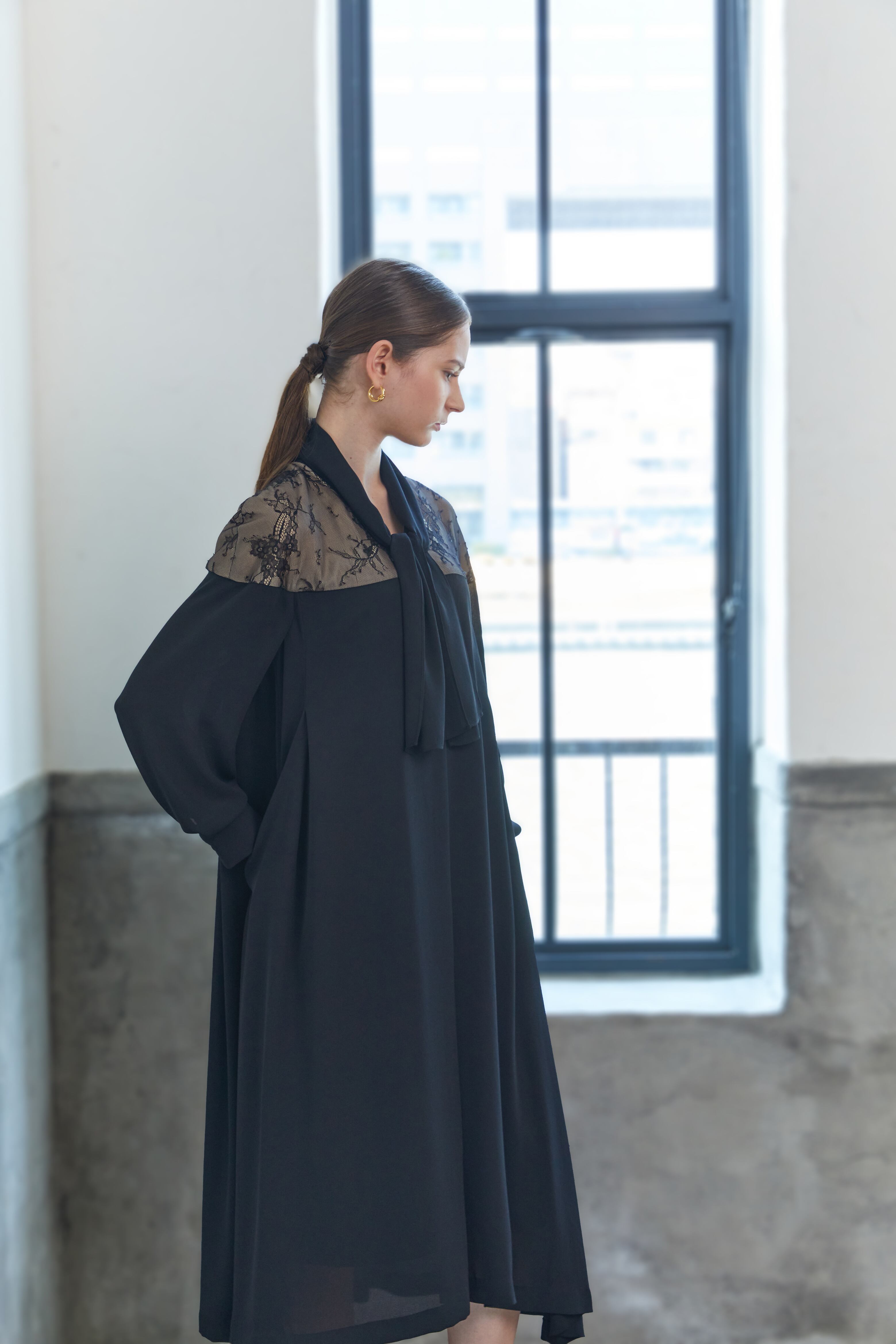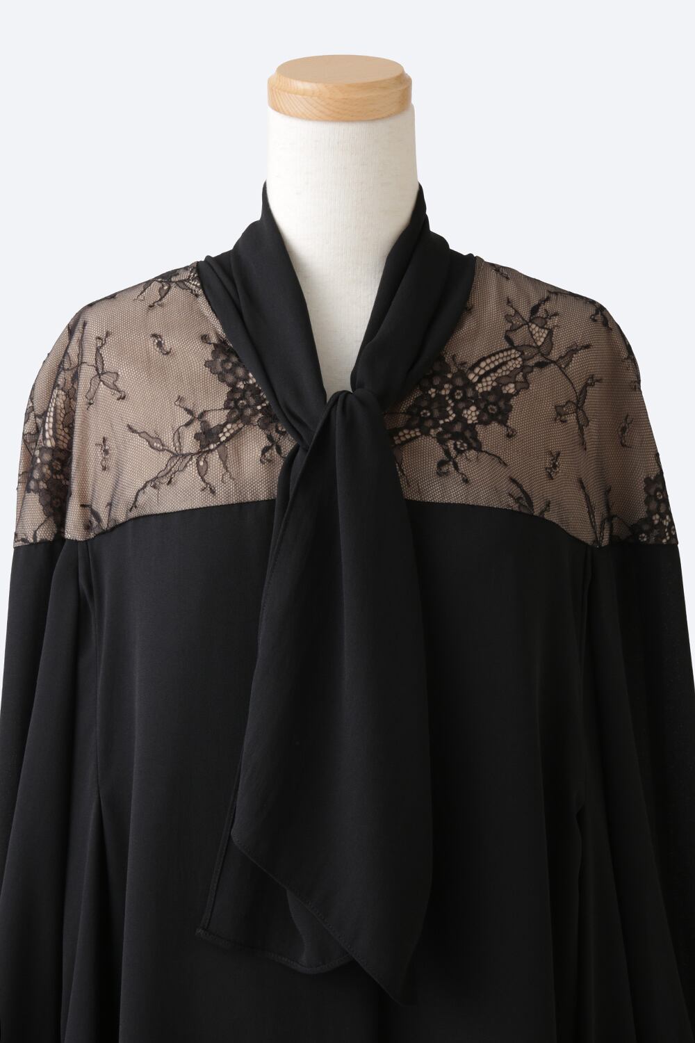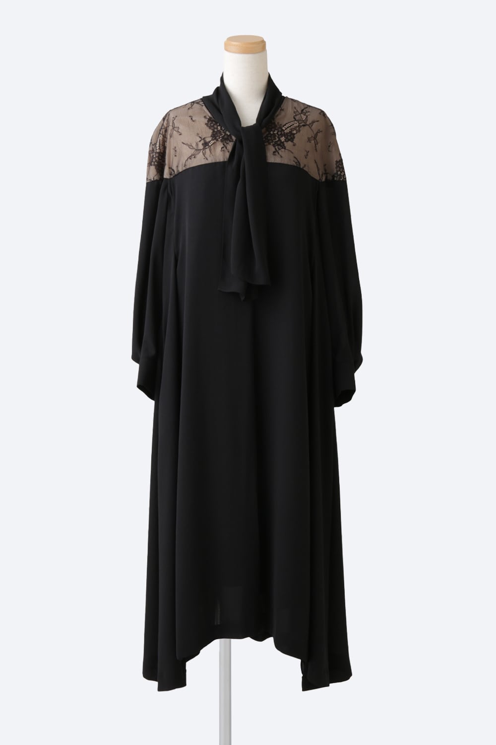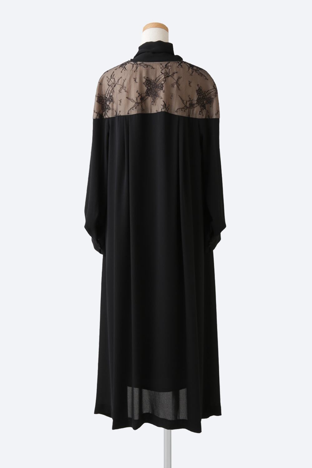 ふんわりとした肌触りと上品な落ち感が魅力のソフトな梨地ジョーゼット素材を使用したフェミニンな雰囲気漂う大人ワンピースです。首元にはクラシカルなムードのボウタイディテールをあしらい、上見頃に施したリバーレースが繊細で優雅なアクセントになっています。自然に広がるフレアータックのシルエットが女性らしい立体感を生み出し、動くたびに軽やかに揺れる美しいフォルムを創り出しています。前開き仕様で着脱しやすく、オケージョンからデイリーまで幅広く対応できるワンピースです。甘さを抑えたディテールと上質な素材使いで大人の女性に相応しい仕上がりになっています。
