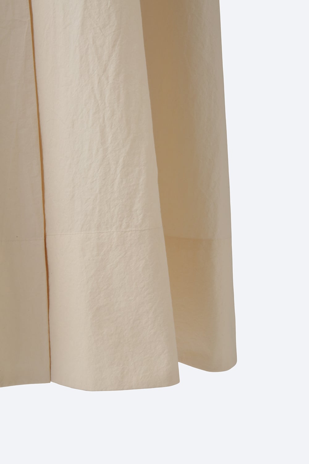 素材の表面に自然な表情を施したコットンシルクのタイプライター。シルク混の高級感とコットンのラフなムードを併せ持つ素材感です。スッキリしたバンドカラーと比翼明き仕様でミニマルなフロントデザインで洗練された印象を演出し、クリーンなイメージに仕上げました。袖口には透け感のあるオーガンザの別布を使用し、その上にリバーレースを重ねた繊細なアクセントをプラスしています。動きに合わせて柔らかく揺れる華やかさを添えています。ドルマンスリーブと身頃のタックディテールの効いたシルエットが、程よいゆとりと立体感を生み出し、身体のラインを拾わない快適な着心地とムードを創り出しています。ドルマンスリーブ、比翼明きと抜け感のあるディテ―ルとオーガンザやリバーレースのフォーマル感を絶妙に融合したDemikitteらしいワンピースに仕上がっています。