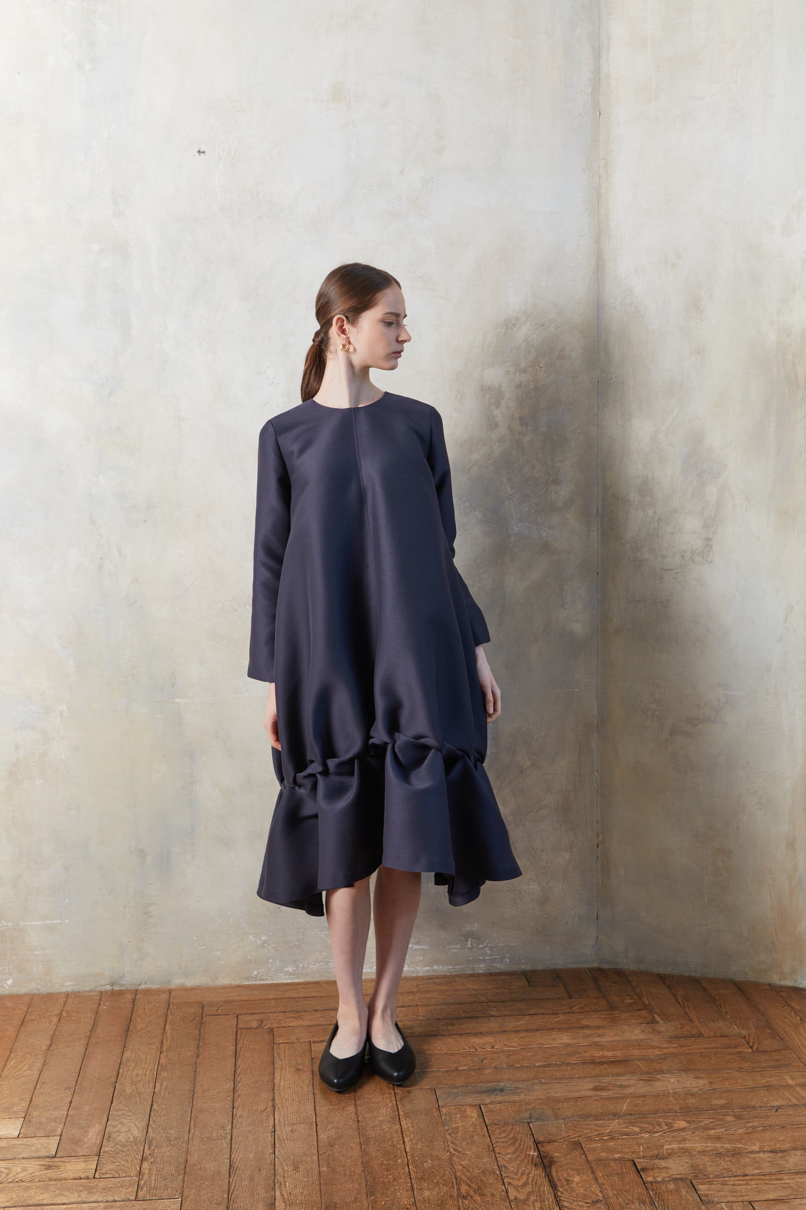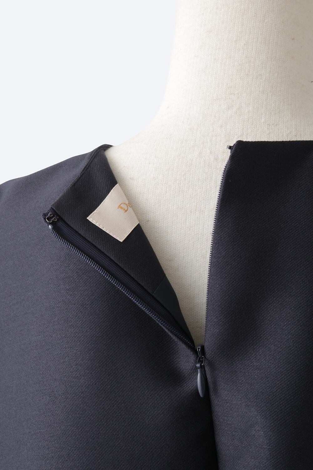 オリジナル性の高いディテ―ルと構築的なシルエットで魅せるモード感漂うボリュームドレスです。素材は経糸に特殊紡績地術によって生まれたMVSポリエステルを使用し、表面はマットでクリアな質感と上品な光沢でエッジの効いた表情を演出しています。空気を含んだような軽やかさと立体感のある素材で存在感のあるドレスに仕上がっています。軽量でシワになりにくい機能を兼ね備えながら、アートのようなシルエットと洗練されたミニマルさを融合したデザイン性の高いドレスに仕上げました。