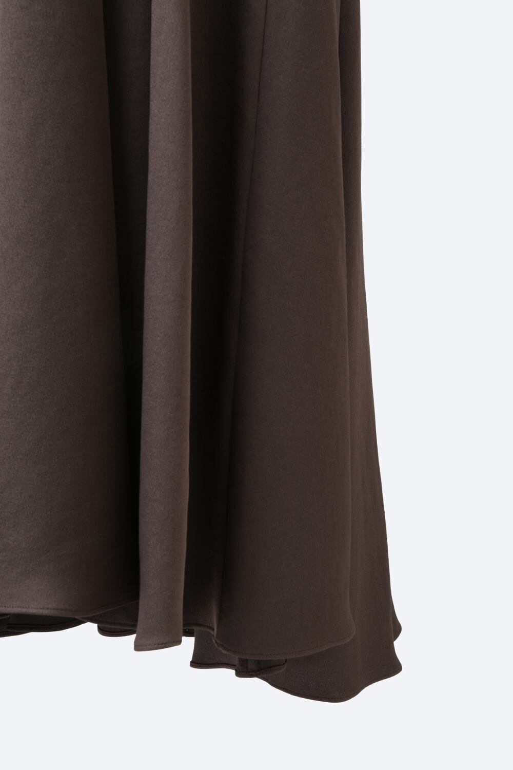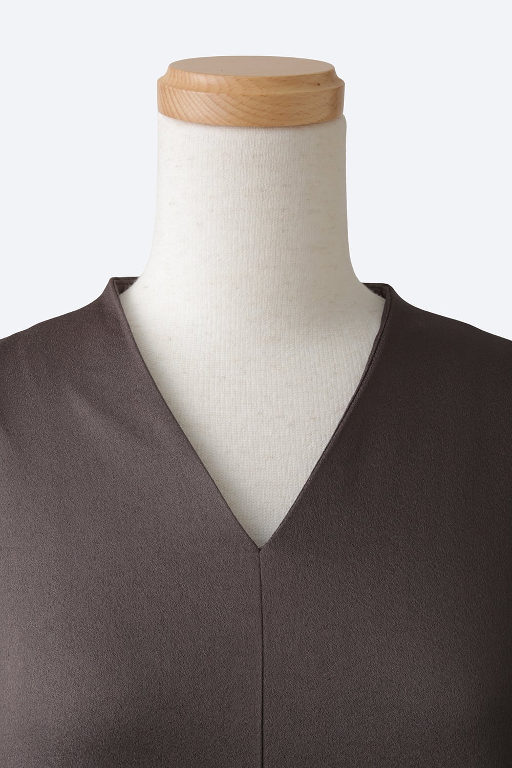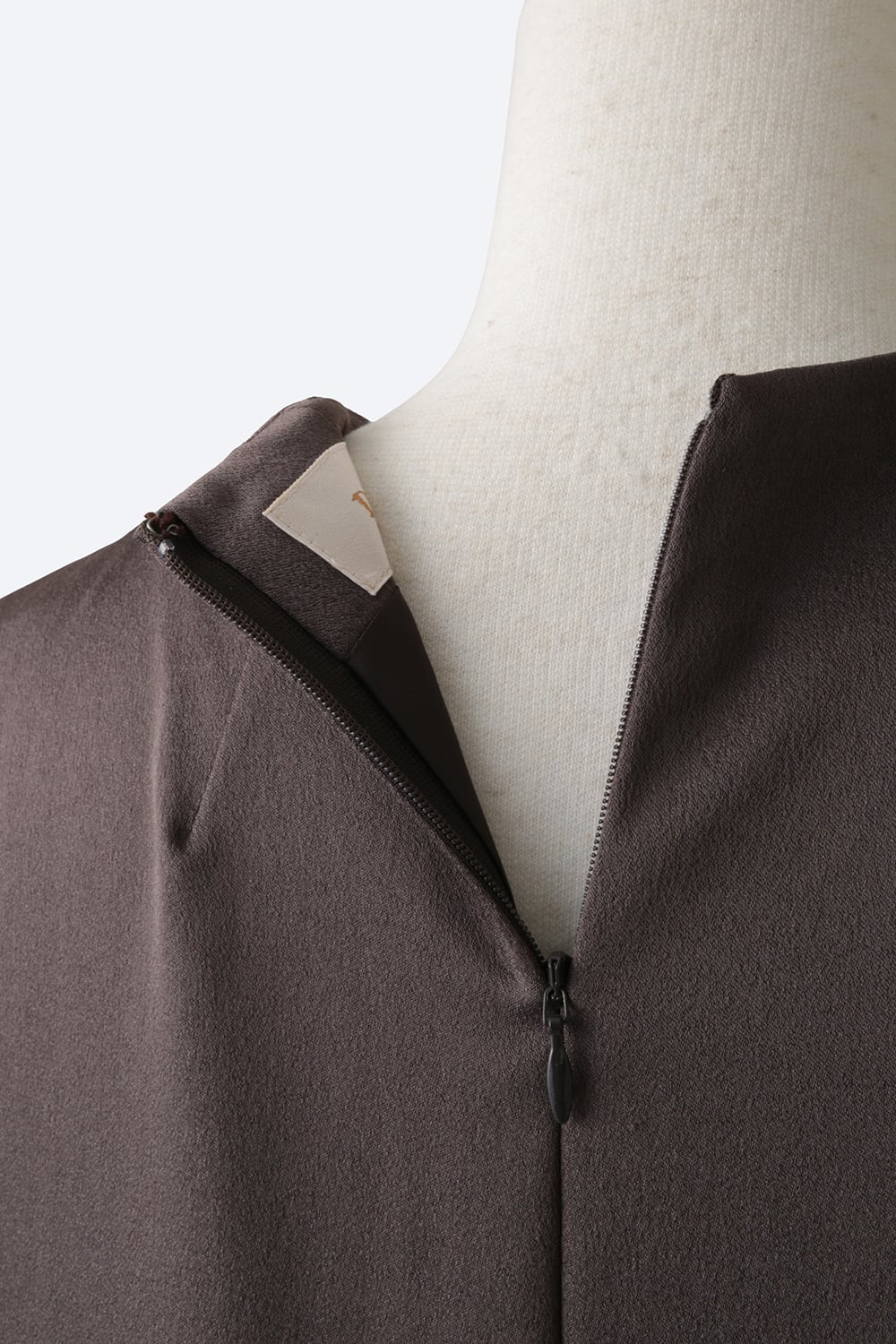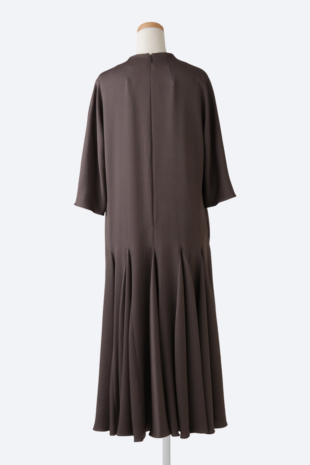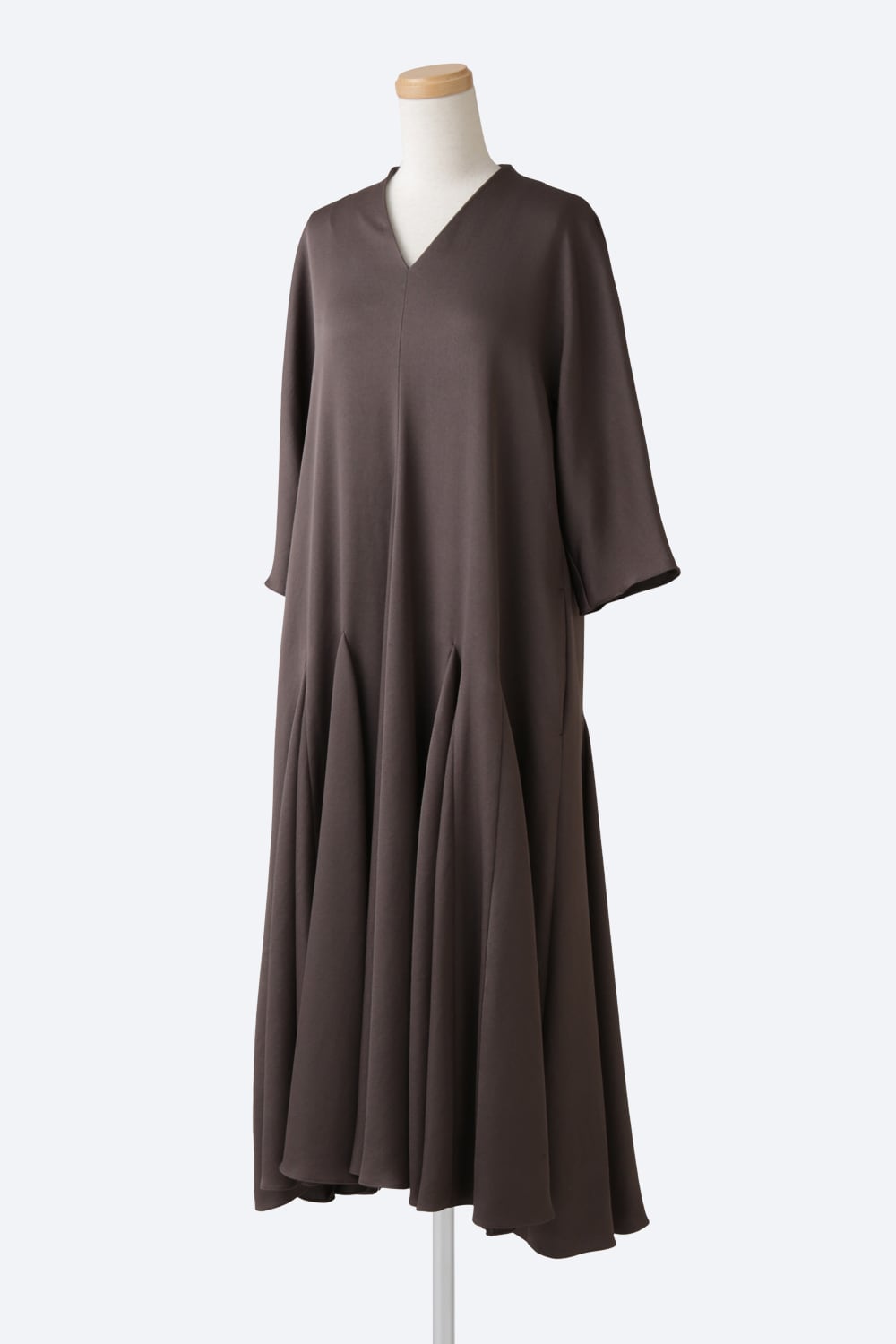 上品なドレープと柔らかな光沢が魅力のバックサテンジョーゼットを使用した軽やかで優雅な印象のマチ付き7分袖ドレスです。肩から身体を柔らかく包み込むドルマンスリーブに、裾にはマチを大胆に施した美しいシルエットになっています。動くたびに広がるエレガントなフレアー感を演出しています。たっぷりとした分量感でありながら、落ち感のある素材により大胆でかつスッキリとした印象になるようにマチの入れ方を工夫しています。手元の軽快さと抜け感をプラスさせ7分袖に仕上げました。袖下のマチは動きやすさを考えながらも、美しいシルエットを損なわないように工夫しています。