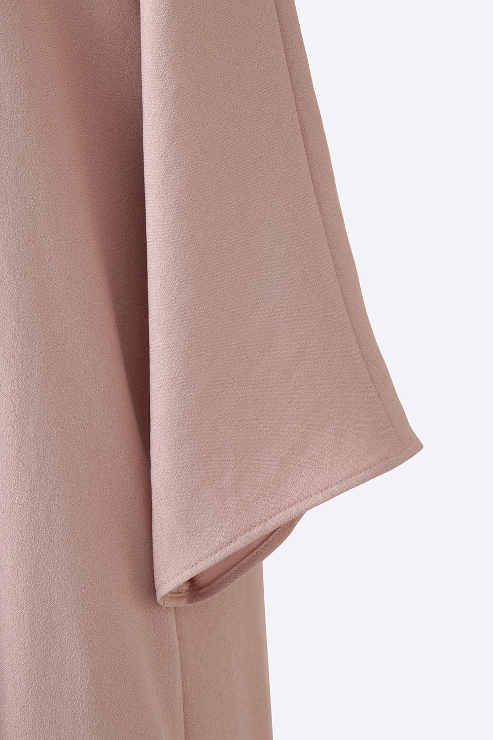 上品なドレープと柔らかな光沢が魅力のバックサテンジョーゼットを使用した軽やかで優雅な印象のマチ付き7分袖ドレスです。肩から身体を柔らかく包み込むドルマンスリーブに、裾にはマチを大胆に施した美しいシルエットになっています。動くたびに広がるエレガントなフレアー感を演出しています。たっぷりとした分量感でありながら、落ち感のある素材により大胆でかつスッキリとした印象になるようにマチの入れ方を工夫しています。手元の軽快さと抜け感をプラスさせ7分袖に仕上げました。袖下のマチは動きやすさを考えながらも、美しいシルエットを損なわないように工夫しています。