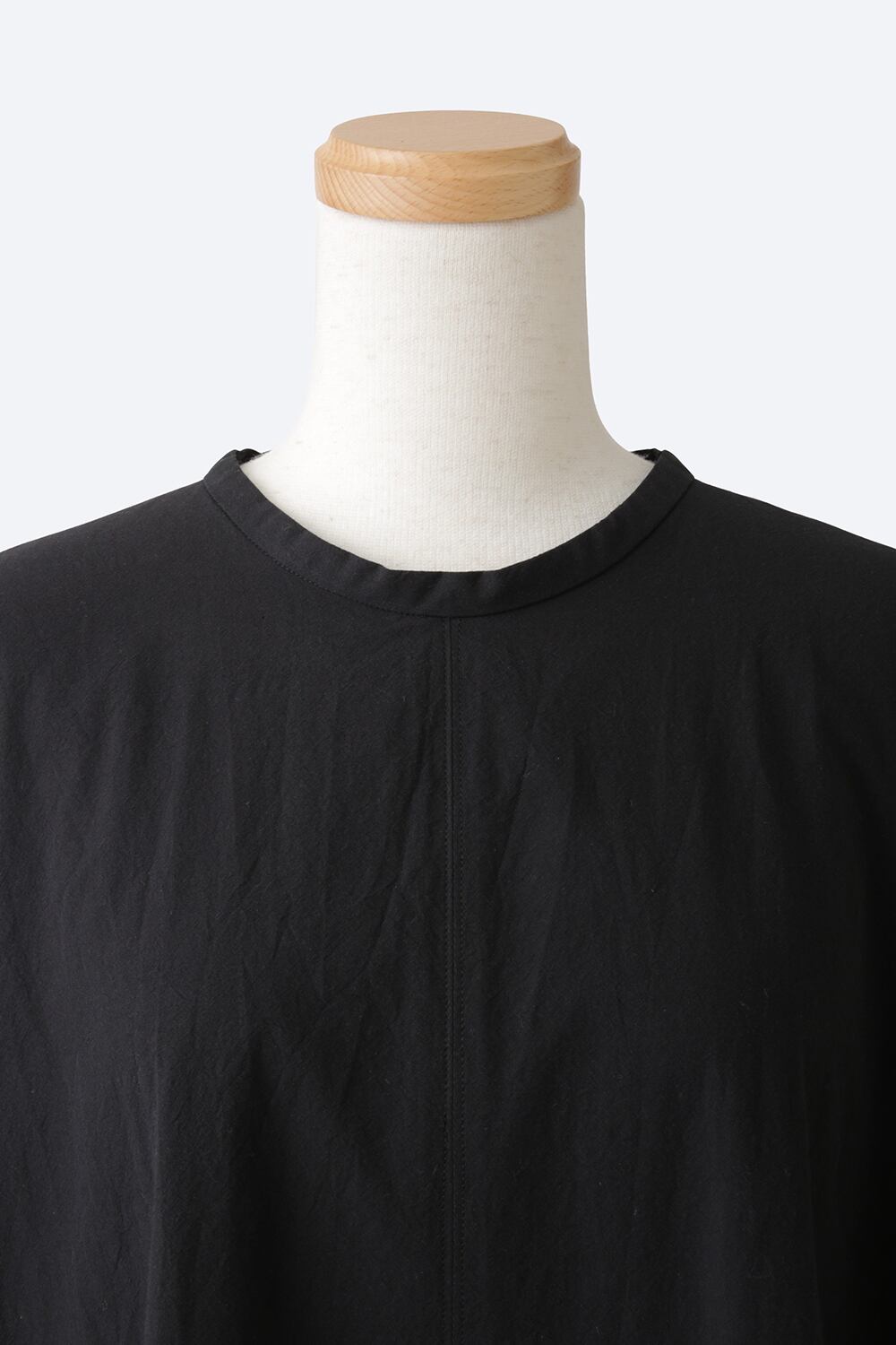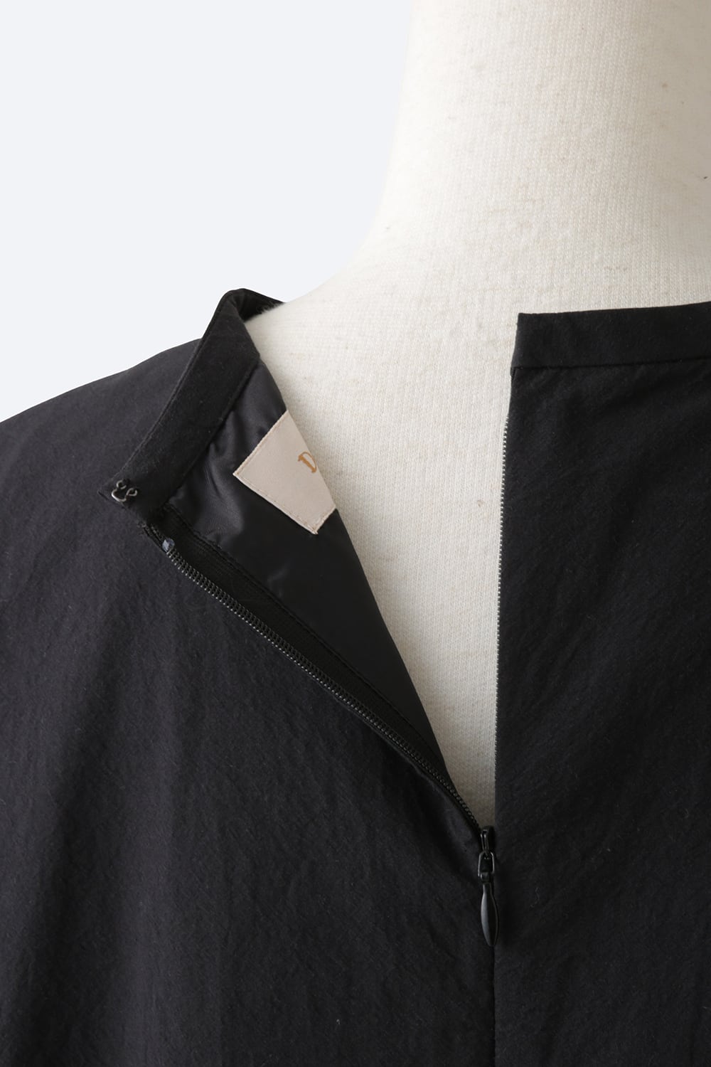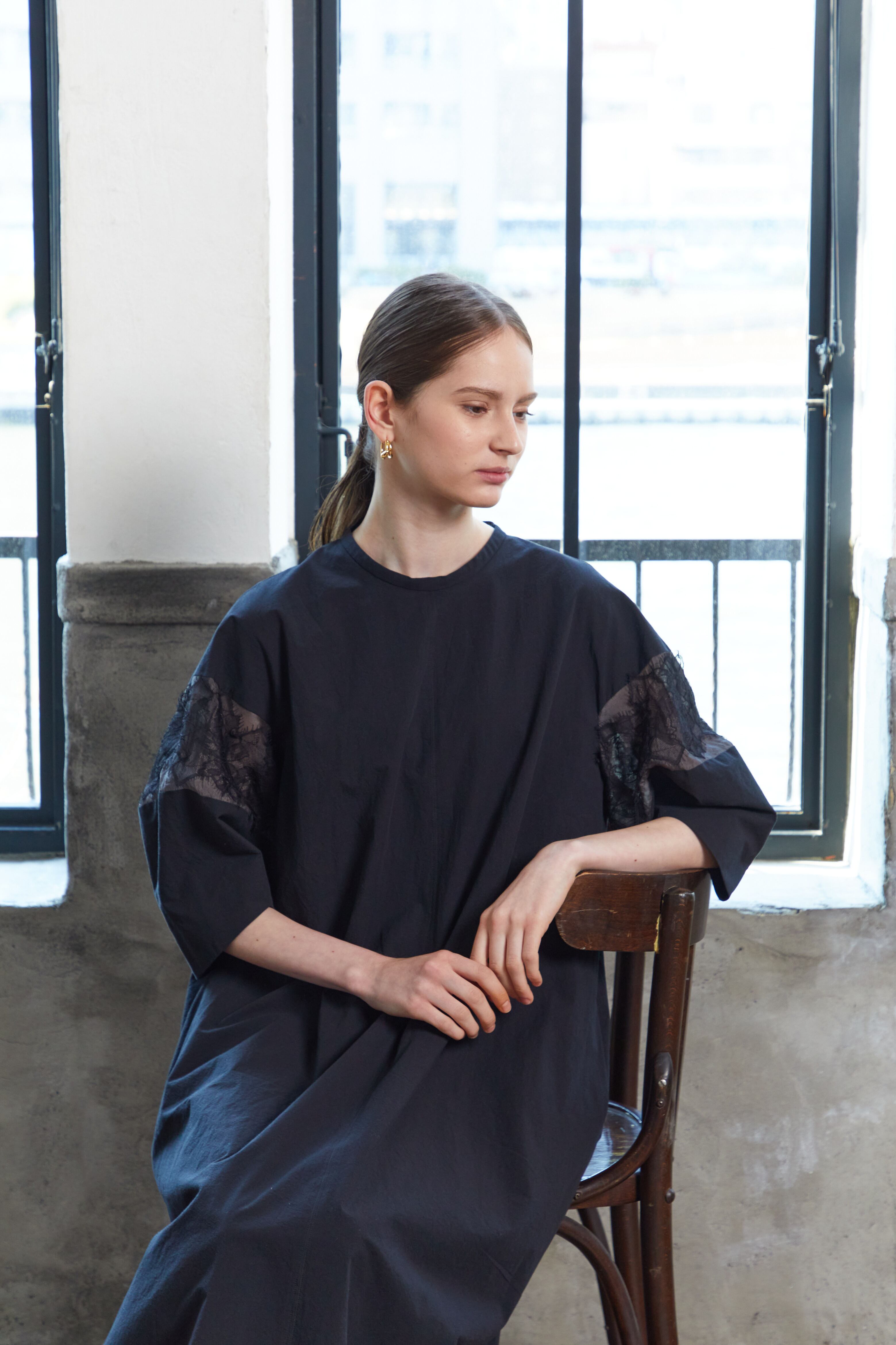 素材の表面に自然な表情を施したコットンシルクのタイプライターです。シルク混の高級感とコットンのラフなムードを併せ持つ素材感です。リラックスしたムードとドレス感を絶妙に持ち合わせたドレスになっています。小さく立ち上がったスタンドカラーとバレルフォルムを生かしたスリーブには糸をより合わせた繊細で高級感のあるリバーレースを施し、カジュアル感の中に繊細で洗練されたモード感のあるムードをプラスしました。リラックスムードとドレス感を併せ持つDemikitteらしいドレスに仕上がっています。