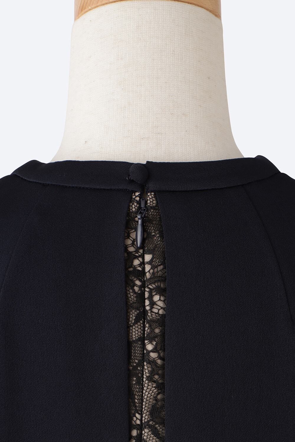 衿ぐりはVネックでシャープに見せながらも前中心の切り替えに量感を付け、着用した際にスイングするような女性らしい動きのある分量感が計算されています。平面的になりがちなレースの切り替えはタック奥で重ねながら、スキンカラーで裏打ちをしてエレガントで女性らしいデザイン性を持たせました。