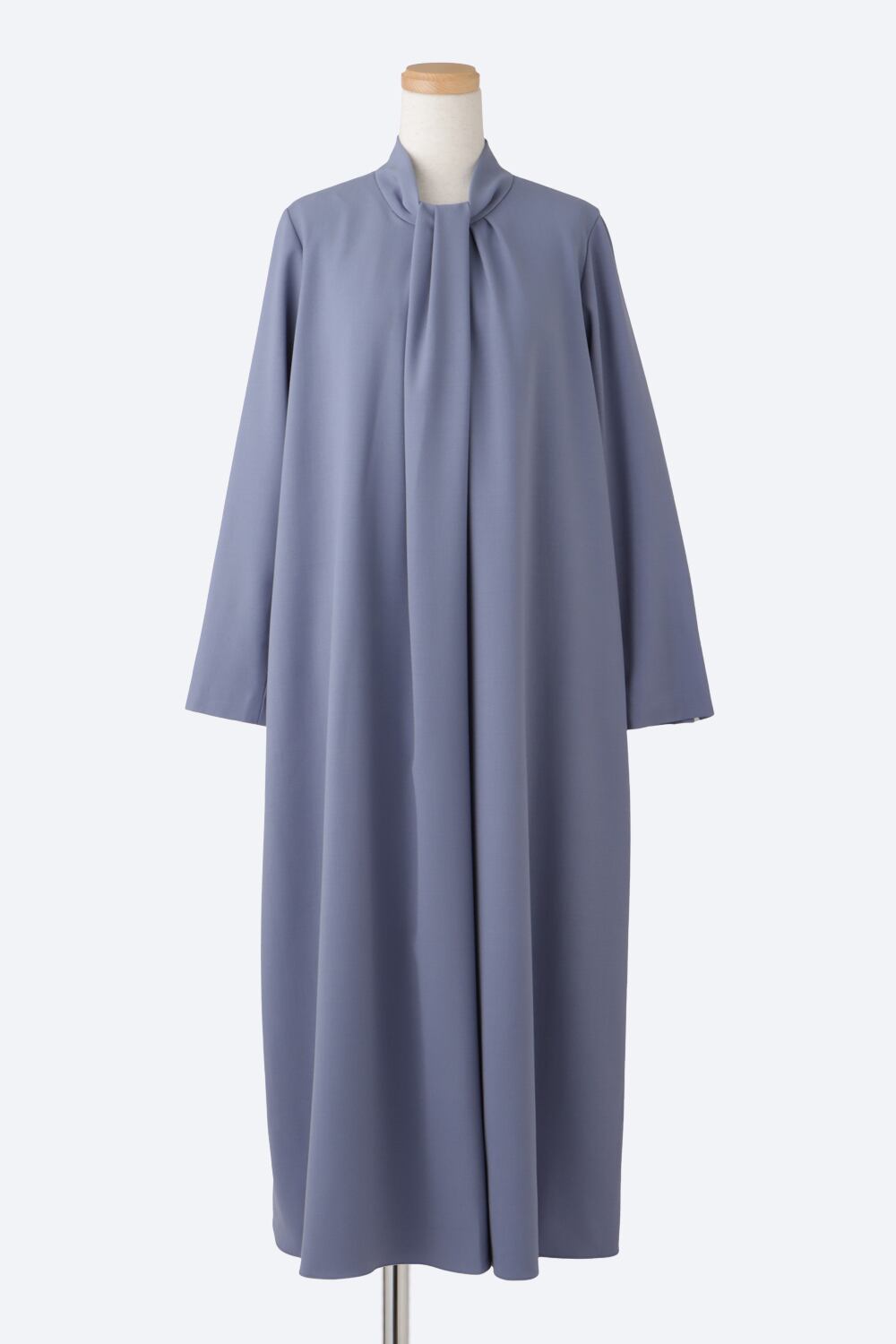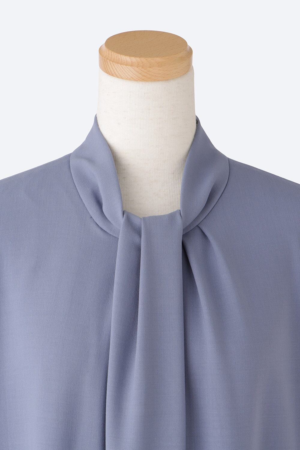 精紡と撚糸を同時に行って作るサイロスパン糸を使って上品な糸の光沢としなやかな質感を持ち、サイロスパンのポリエステルを使用することでより柔らかい風合いを作り出している素材です。ボウタイが一続きになったように見える変形的なボウタイデザインで首元にデザイン性を持たせたワンピースです。デザインディテ―ルを引き立たせるため、シルエットはシンプルなナローラインですっきりとしながらも、身体のラインを拾わない絶妙なフォルムで体型を気にせずに着こなして頂けるワンピースに仕上がっています。ボタンで調整可能な袖口のスリットはやや長めで動いた時に手首が美しく見える様に計算されています。